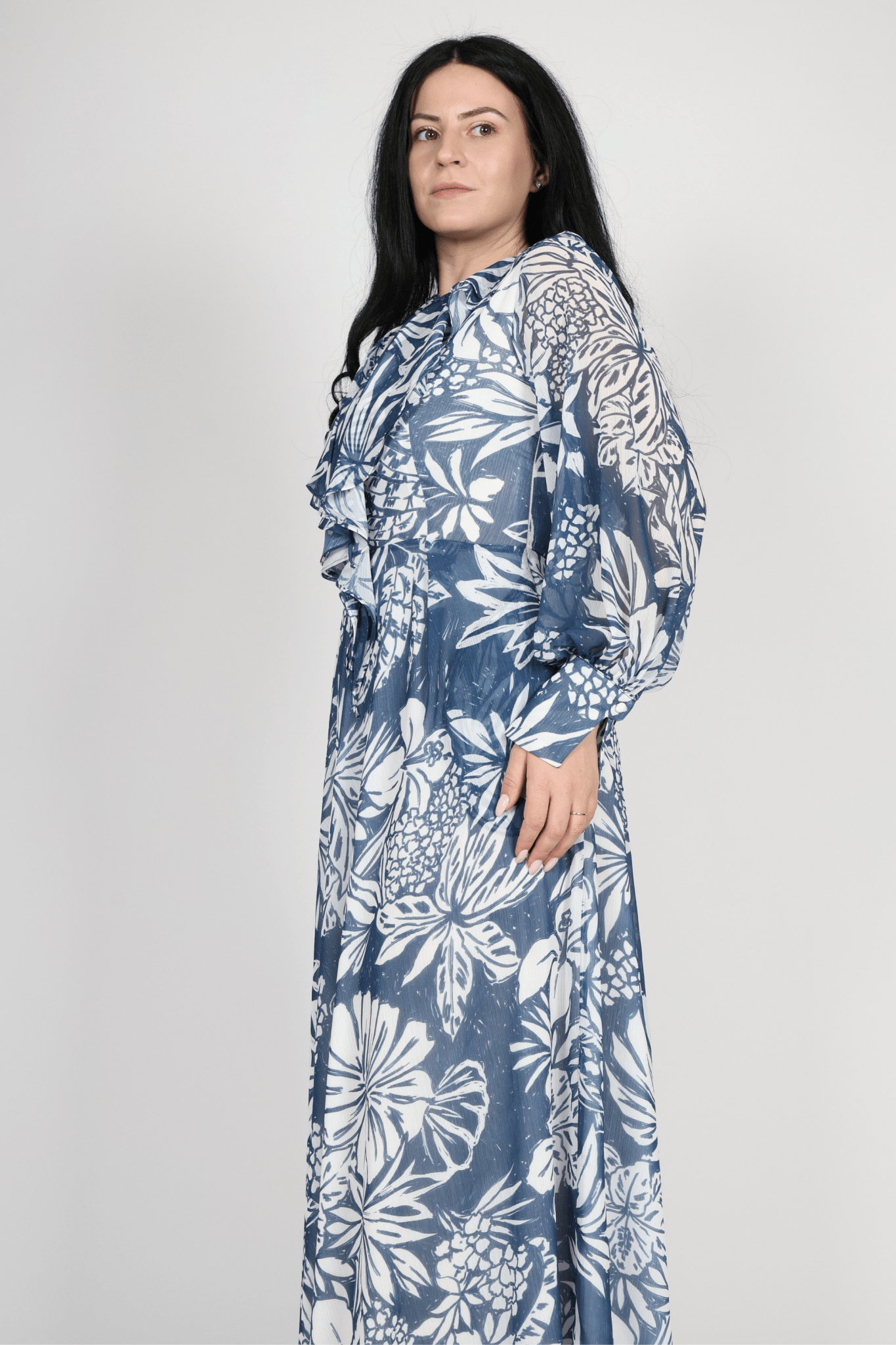 • High collar with decorative tie and ruffles at the front – adds femininity and elegance